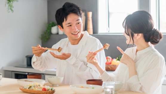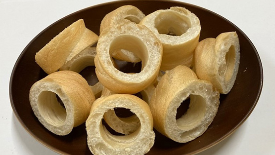 当社の「くるま麸」は、良質な小麦粉からとれる植物性たんぱく質(グルテン)を主原料に、直火焼きで香ばしさを引き出しています。グルテンの配合量が多いため、炒めても崩れにくく、水戻りが早い時短食品としても好評です。